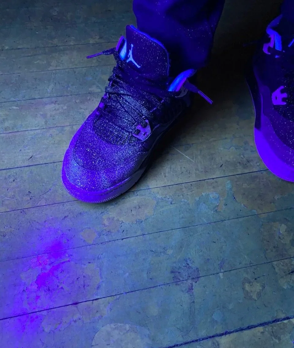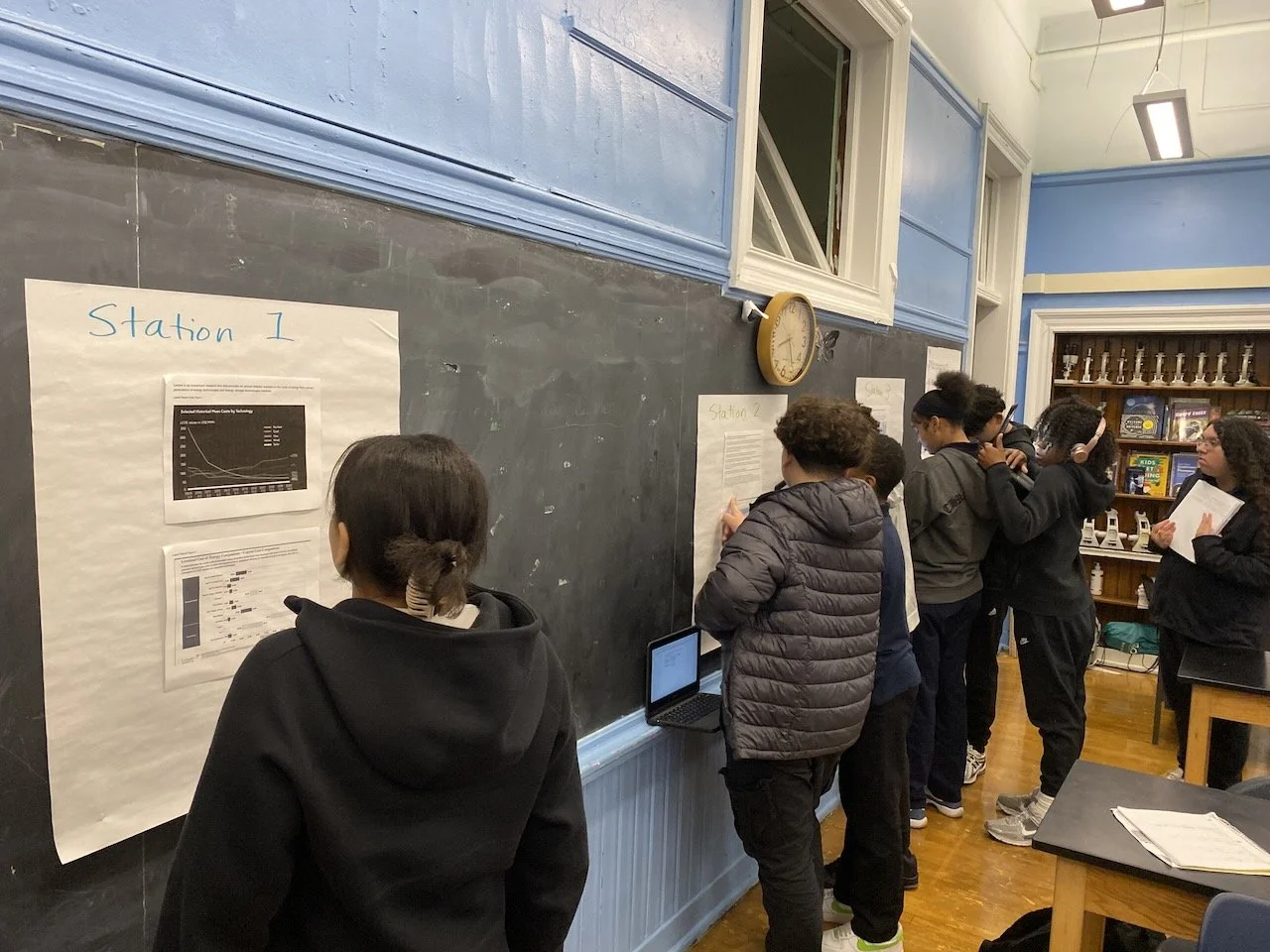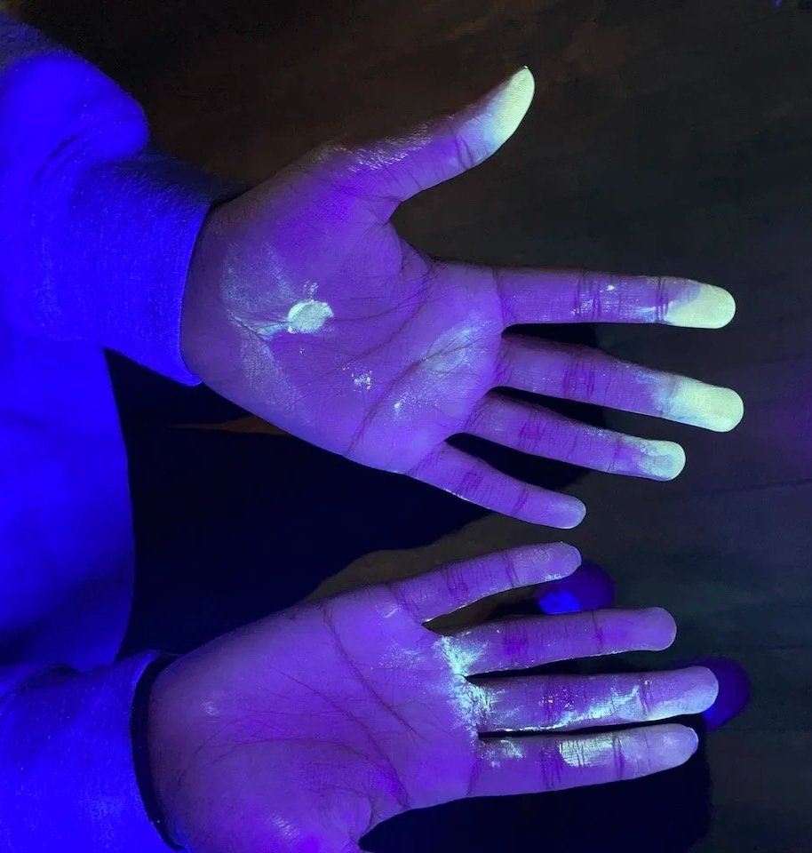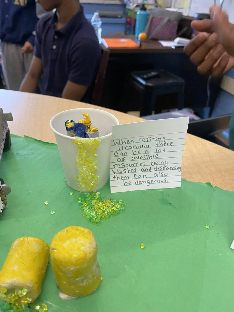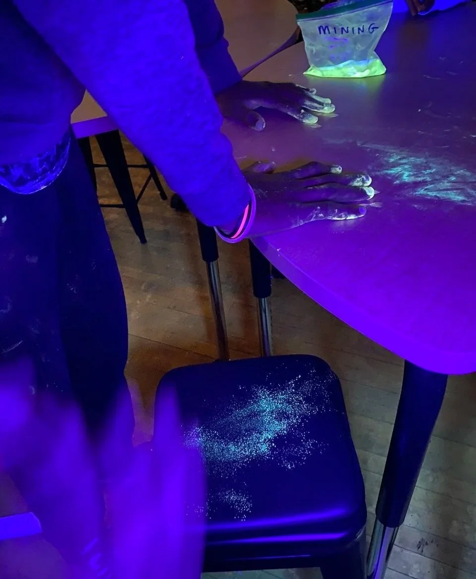 To learn more about this nuclear fuel cycle, stations were set up around the room representing different steps in the cycle for students to learn about each step and its impact on humans and the environment. Each station had a step involving a powder that represented the fuel: uranium. At the end of the activity, the light was switched off, and a UV light was turned on, revealing that the powder was glow-in-the-dark and covered students' clothes, shoes, and even hair. This was meant to represent possible risks of leaks and pollution, not necessarily through explosive accidents, but through daily operations, that are invisible and untraceable to human senses.